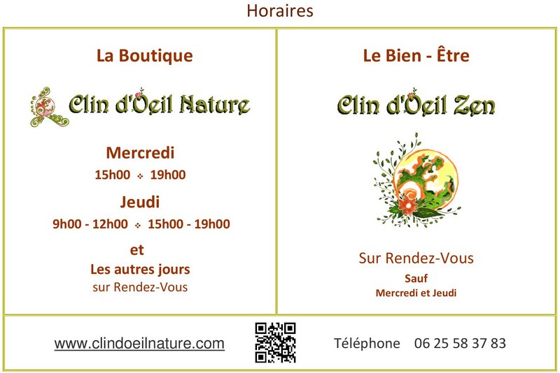 Les séances sont uniquement proposées dans un esprit de confort et de bien-être et n’ont aucune visée ni thérapeutique, ni médicale, ne sont associées à aucune technique de kinésithérapie. Elles ne sont pas assimilables aux actes réservés aux professions de santé réglementées. Clin d’Oeil Nature n’effectue aucun diagnostic médical, et travaille sous entière confidentialité, le respect de la vie privée et le respect de la personne. Pensez à signaler toute(s) éventuelle(s) contre-indication(s) Les séances ne seront pas données aux femmes enceintes, ni aux mineur(s-es), ni aux personnes se connaissant une ou des contre indications*, sauf sur présentation de l’avis favorable de votre médecin et tout avis médical favorable, lesdits avis avec des dates proches du ou des rendez-vous. En cas de suspicion quelconque, les séances ne seront pas pratiquées. *Exemples : Opération médicale ou autre récente, fièvre, plaies, diverses maladies, mycoses, acné, diabète… Chez Clin d’œil Nature, comme le bien-être, le calme est aussi une priorité. Votre installation et votre départ ne sont pas compris dans les durées indiquées.